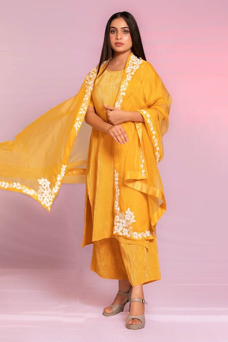 Yellow pleated kurta featuring a round neckline and half sleeves. Paired with a matching pleated palazzo and a dupatta adorned with floral embroidered borders.