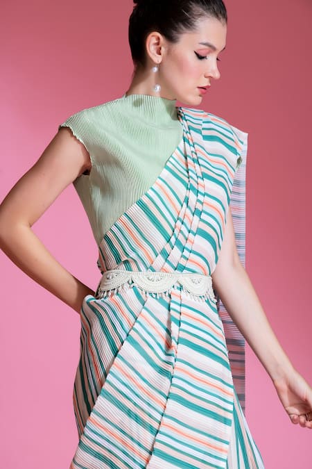 Belt with beads and pearl work, High neck pleated blouse, Unique stripe pattern