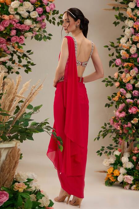 Hot pink pre-draped saree in georgette featuring pleated drapes and an attached draped pallu. Paired with a sweetheart neck blouse adorned with pearl, sequin, and mirror embroidery, along with an embroidered belt.