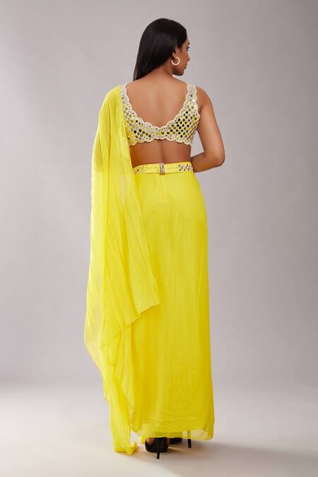 Yellow draped saree paired with mirror & pearl embroidered sleeveless scallop blouse. Comes with mirror embellished belt.