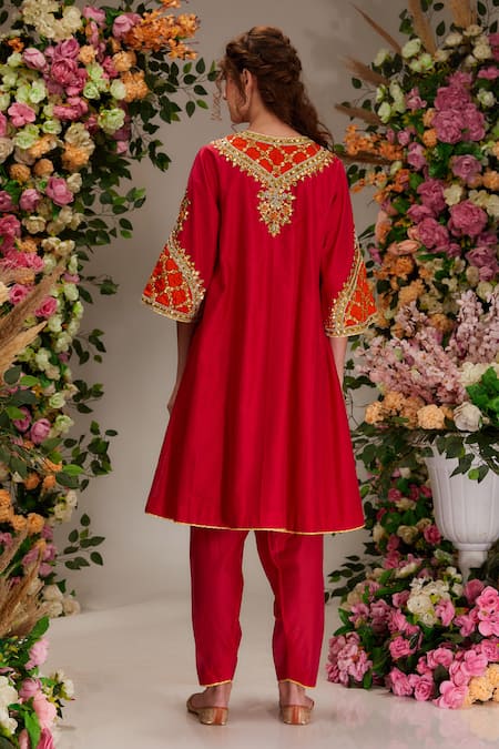 Fuchsia short A-line kurta featuring gota, moti & sequin embellishment. Paired with a salwar and an orange sheer dupatta.
