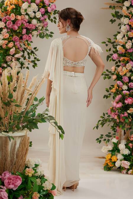Cream pre-draped saree in georgette base featuring intricate cutdana, sequin, and moti embroidery. Paired with a blouse showcasing fringed sleeves and an embellished belt.