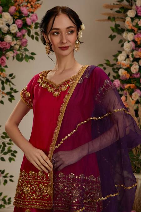 Pink silk kurta featuring intricate gota work in floral patterns, paired with a matching sharara. Accompanied by a purple organza dupatta with fringed lace details and a back cutout with tassels.
