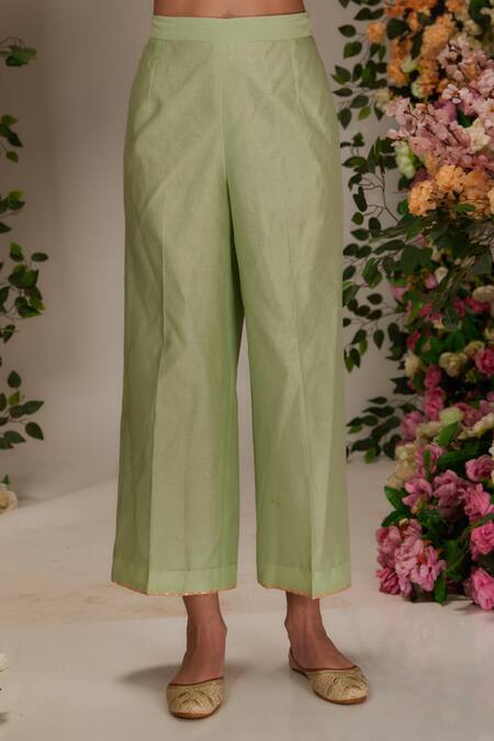 Green Chanderi, Cotton, Organza Embroidery Round Neck Floral Kurta Pant Set