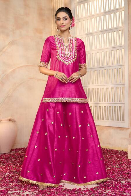 Fuchsia straight short kurta in dupion fabric featuring floral gota embroidered yoke, cuffs, and laced hem. Paired with a floral butti embroidered sharara and a dupatta with kiran fringed lace.