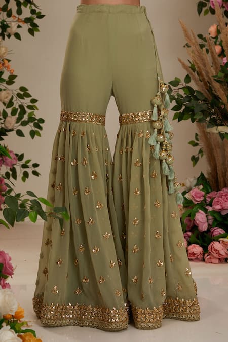 Green Georgette, Organza Gota Patti Round Neck Floral Work Kurta Gharara Set