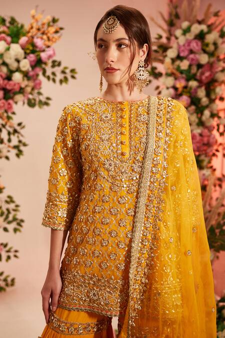 Yellow Georgette, Organza Gota Patti Floral Jaal Embroidered Kurta Gharara Set