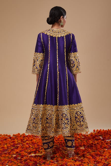 Midnight blue long anarkali featuring gold toned florid gota embroidery, sequins, and pearls. Paired with a gota floral jaal embellished salwar and contrasting fuchsia pink organza dupatta with lace border.