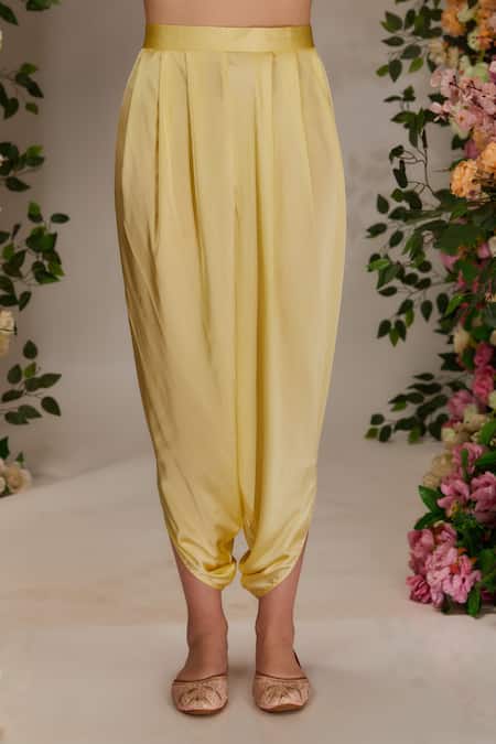 Yellow Chanderi, Satin, Cotton Embroidery Flower A-line Kurta With Dhoti Pant