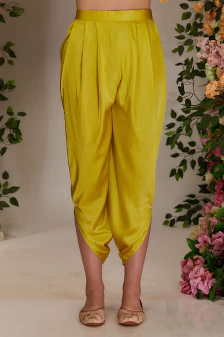 Yellow short a-line kurta featuring gota, sequin, and moti work on the neckline and hem. Paired with a draped samosa dhoti pant and a blush pink organza dupatta.