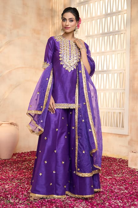 Blue straight kurta in dupion base featuring floral pattern gota embroidery on the yoke, cuffs, and laced hem. Paired with a floral butti embroidered dupion sharara and a laced dupatta.
