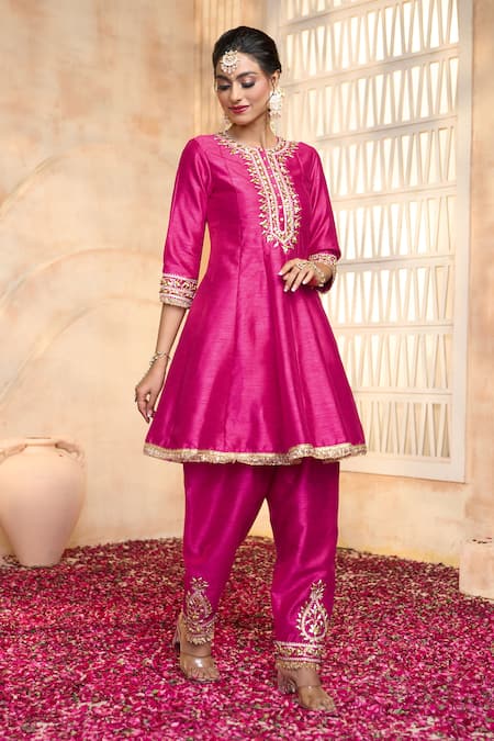 Fuchsia Silk, Viscose, Organza Gota Patti, Lace Embroidered Short Anarkali Set
