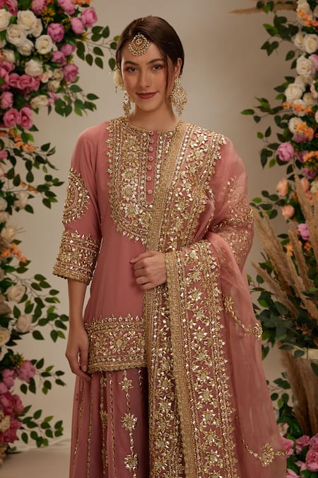 Purple kurta featuring gota work in floral pattern with embellished show buttons. Paired with a matching sharara and an organza dupatta adorned with intricate gota detailing.
