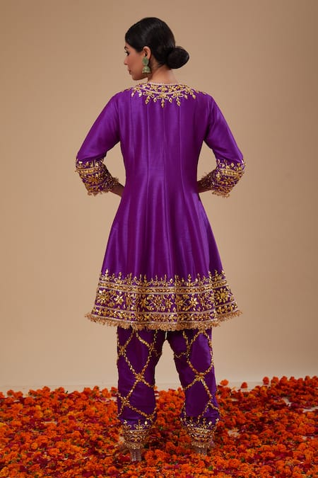 Purple short anarkali featuring gold toned floret gota embroidery and sequin, pearls highlights. Paired with a gota floral jaal embellished salwar and contrasting red organza dupatta with kiran lace border.