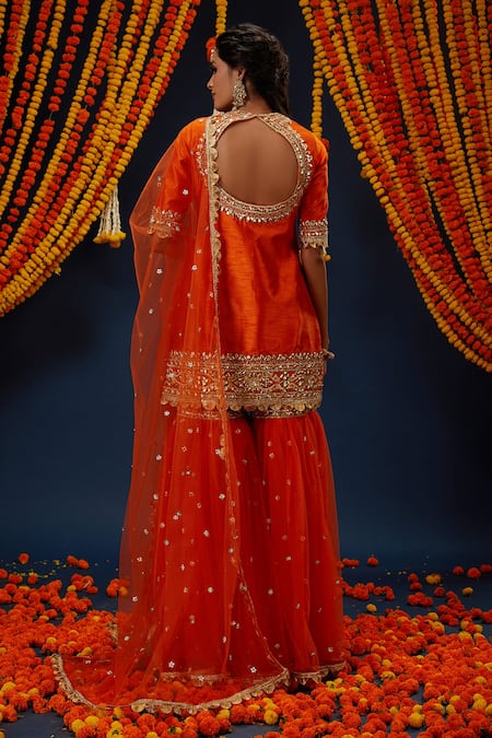 Orange kurta featuring gota embroidery and side zip closure. Paired with a matching gharara and net dupatta.