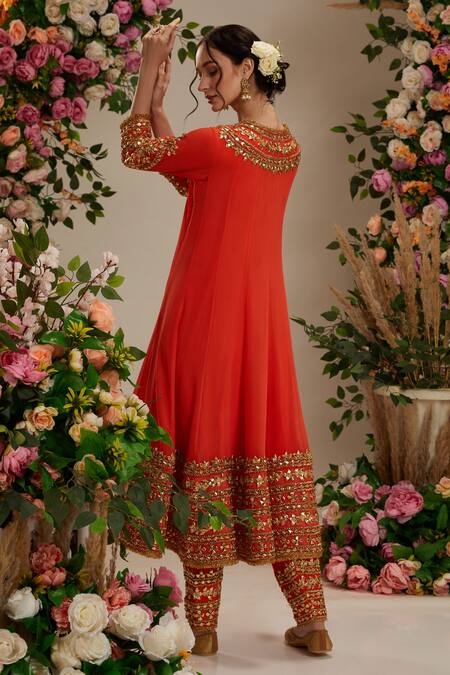 Coral anarkali featuring intricate handmade gota work in floral patterns. Paired with embroidered hem salwar and a pure organza dupatta.