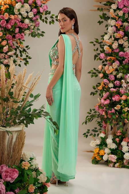 Aquamarine pre-draped saree made from georgette featuring pleated drapes and an attached draped pallu. Paired with a sweetheart neck blouse adorned with floral patterns and pearl, sequin, and mirror embroidery, along with a matching belt.