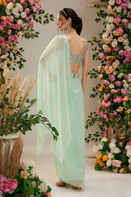 Pista green pre-draped saree made of georgette featuring pleated drapes and an attached draped pallu. Paired with a V neck blouse adorned with floral pattern, pearl, sequin, and mirror work, along with an embroidered belt.