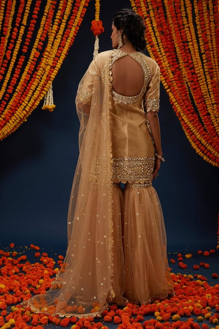 Beige Silk, Net Gota Patti Round Neck Kurta Gharara Set
