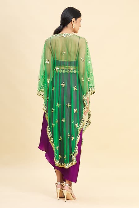 Green cape with mirror work embroidered & sequin border. Paired with embroidered crop top & draped skirt.