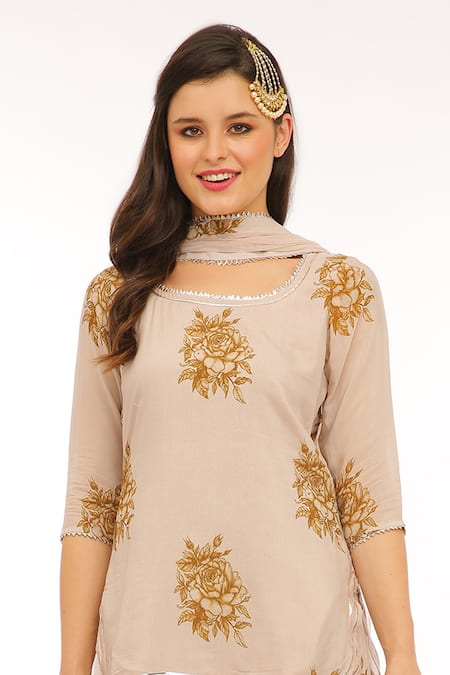 Buy_Preevin_Beige Cotton, Net Embroidery Round Neck Floral Peplum Kurta Set _at_Aza_Fashions