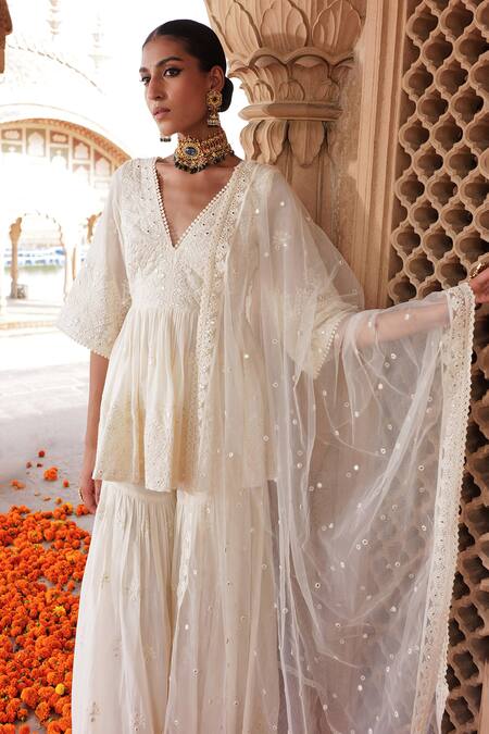 Off white peplum kurta featuring a V neck, bell sleeves, and intricate thread, mirror & sequin embroidery. Paired with a flared embroidered sharara and a dupatta adorned with crochet lace border.
