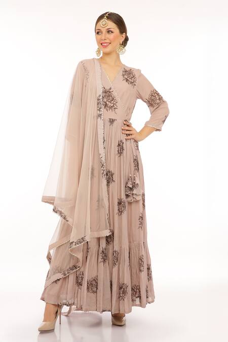 Beige floral embroidered Anarkali featuring a flowy silhouette and a soft net dupatta. The set includes an Anarkali and a matching dupatta adorned with intricate floral designs.