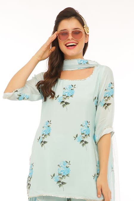 Ice blue peplum kurta featuring floral print and a round neckline. Paired with a matching sharara and a soft net dupatta.