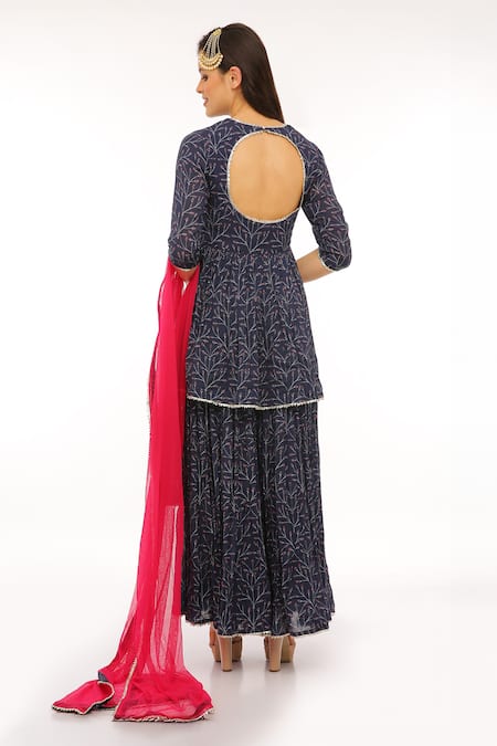 Indigo blue peplum kurta with floral print and a round neckline. Paired with a matching sharara and a hotpink dupatta in soft net.