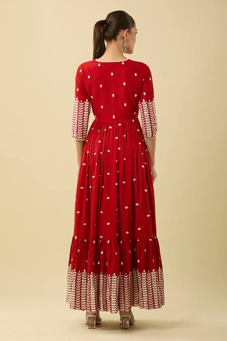 Red angarkha kurta featuring pleated tiers and leaf pattern embroidery. Paired with a sheer dupatta adorned with thread work details.