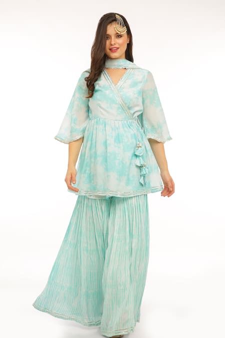 Ice blue printed peplum kurta featuring three-quarter sleeves and a wrap design. Paired with a matching sharara and a soft net dupatta.