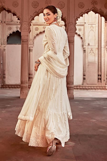 Off white angrakha anarkali featuring mirror and thread embroidery with a ruffle layered hem. Paired with a matching dupatta adorned with a mirror work lace border.
