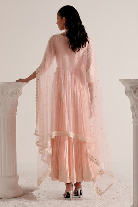 Blush pink tiered angarkha featuring thread and mirror embellishment with tassel detailing in the front. Comes with a sheer mirror & thread embellished dupatta.