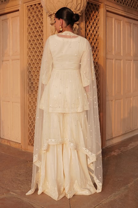Off white peplum kurta featuring a V neck, bell sleeves, and all-over vintage pattern with tonal thread, mirror, and sequin embroidery. Paired with an embroidered flared sharara and dupatta with crochet cut work lace border.