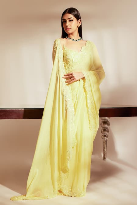 Yellow saree featuring floral sequin embroidery with a scallop border. Paired with a jaal embroidered blouse and petticoat.