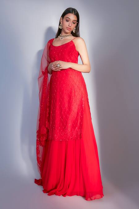 Red Kurta Silk Lehenga Georgette Dupatta Tulle Cutdana, Embroidered Set