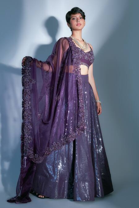 Purple pleated flared lehenga with sequins embellishments. Paired with jaal embroidered blouse & organza dupatta with paisley motif embroidery.