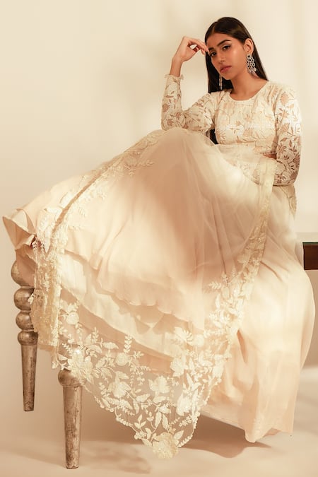 Ivory Tulle, Georgette Embroidery, Sequins Round Neck Lotus Blouse Lehenga Set