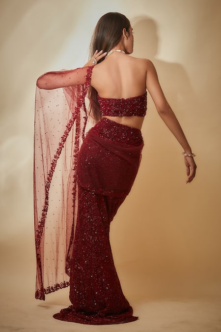 Maroon saree featuring hand embroidered sequins work with a sweetheart neckline. Paired with a sleeveless blouse and crafted from tulle and buttercrepe fabrics.