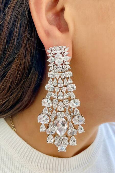 Silver-toned necklace featuring a 5-layer drop pattern with white diamante embellishments. Accompanied by a pair of earrings, a bracelet, and a ring.