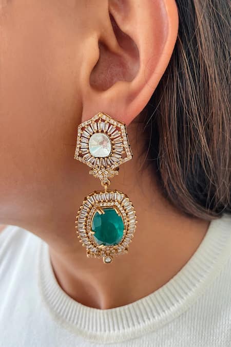 Emerald green brass choker necklace featuring a pendant style design with baguette-cut detailing and an emerald doublet centerpiece. Paired with coordinating stud earrings.