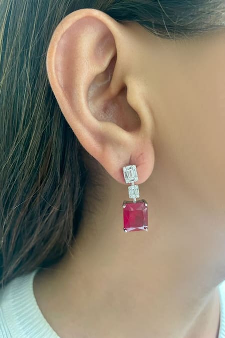 Baguette and diamond line design, Ruby-colored stone pendant, Zircon crystal embellishments