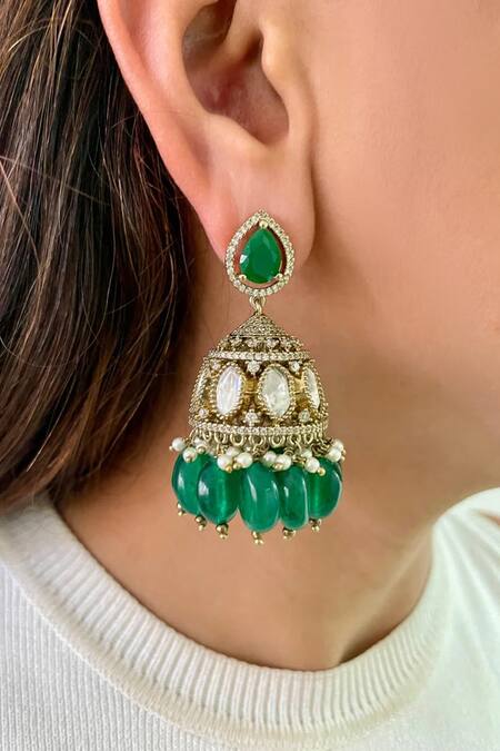Emerald necklace featuring three layers of Polki stones with green drops. Paired with matching earrings adorned with semi-precious stones.