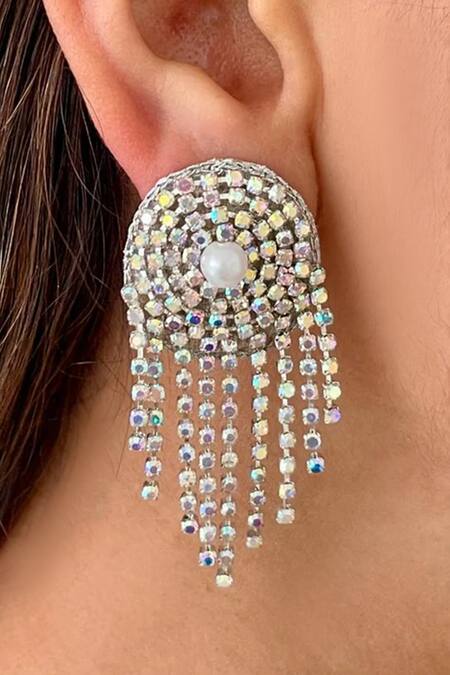 White crystal embellished necklace featuring a cascading fringe design. Paired with matching earrings adorned with semi-precious stones and a pearl accent.
