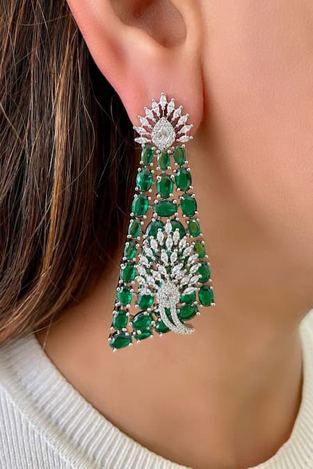 Emerald green choker necklace featuring diamond motif embellishments. Includes a pair of earrings, a bracelet, and a ring, all designed with semi-precious stones.