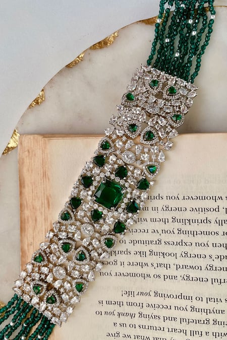 Silver tone choker featuring emerald embellishments and geometric cutwork pattern. Paired with matching earrings that complement the choker's design.