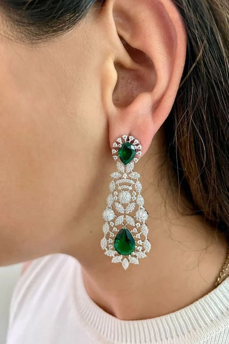 Emerald necklace featuring diamond stones with floret detailing. Paired with matching earrings that showcase similar emerald and diamond embellishments.