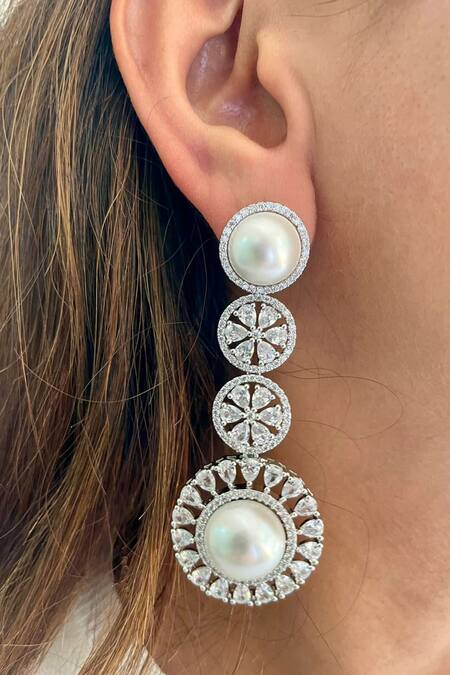 White necklace featuring faux diamonds and pearls in a contemporary design. Paired with matching earrings that complement the necklace's embellishments.