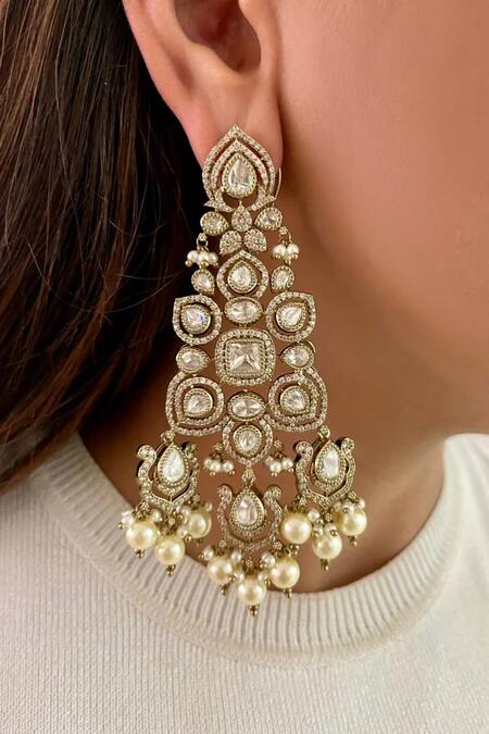 Intricate floral motifs with Kundan stones, Pearl drop embellishments on earrings, Handcrafted detailing with semi-precious stones
