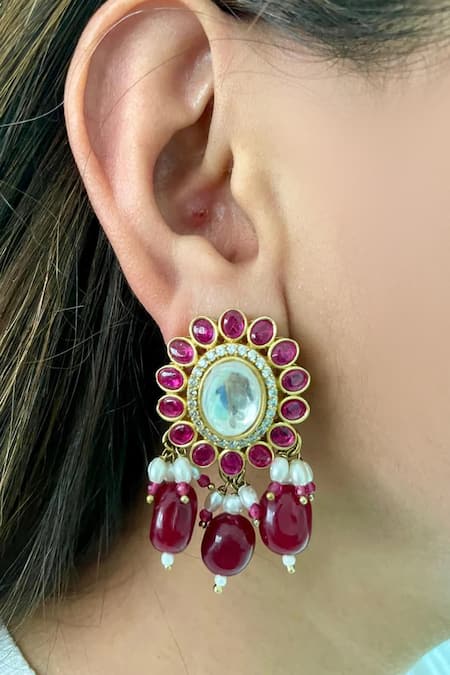 Red Gemstones, Pearls Gul Floret Kundan Polki Necklace Set